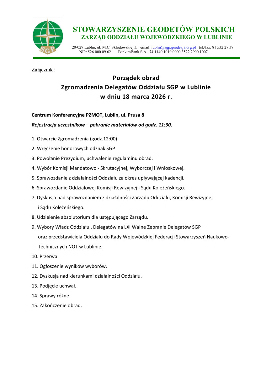 Zarząd Oddziału SGP w Lublinie zgodnie z § 43 Statutu SGP informuje, że w dniu 18 marca 2026 r. (środa) o godz. 12:00 (rejestracja od godz. 11:30) rozpocznie się Walne Zgromadzenie Delegatów Oddziału Stowarzyszenia Geodetów Polskich w Lublinie.