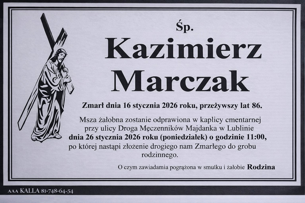 Uroczystości pogrzebowe odbędą się w kaplicy cmentarnej przy ul. Droga Męczenników Majdanka w Lublinie w dniu 26 stycznia 2026 r. (poniedziałek) o godz. 11:00.